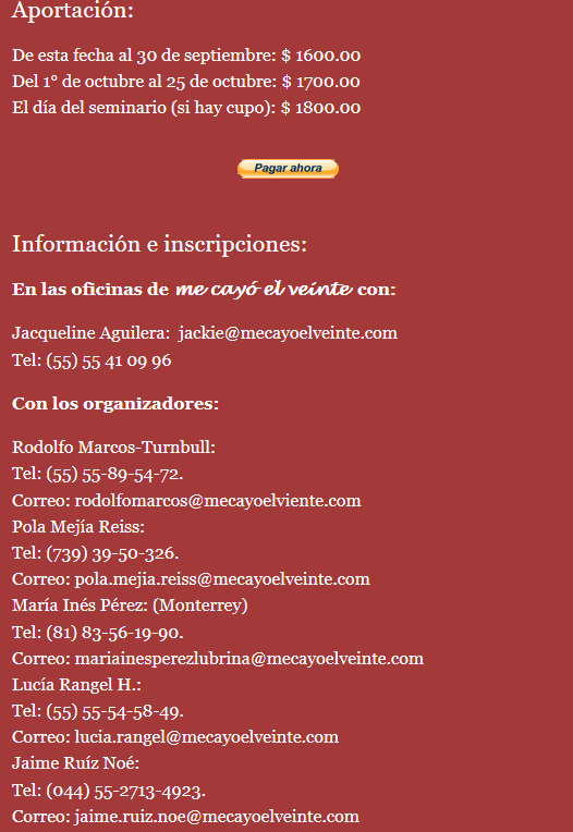 Expositores: Susana Bercovich, Laurent Cornaz, Manuel Hernández, Rodolfo Marcos-Turnbull, Gabriel Meraz Arriola, Antonio Montes de Oca T., Rafael Omar Perez, Lucía Rangel Hinojosa.